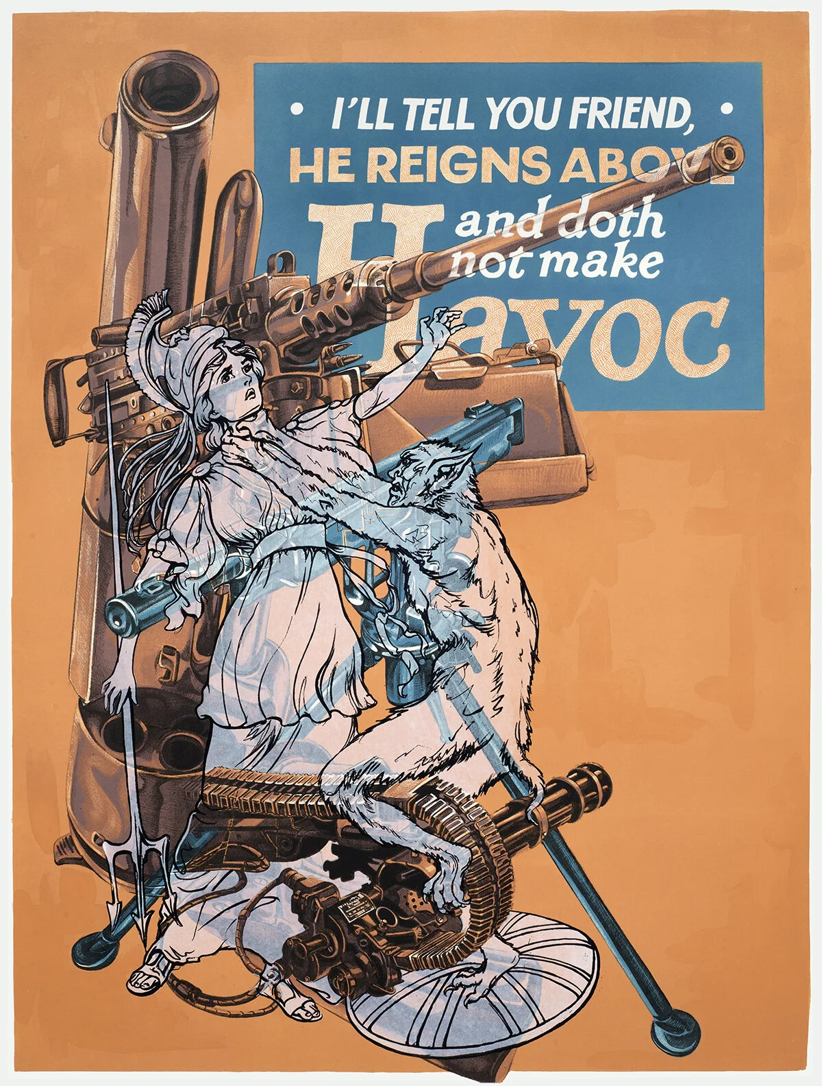 These works use the lithographic propaganda platform to look more broadly at problematic domestic legacies of colonialism, in addition to the military musculature of national identity. They suspect the efficacy of insisting upon white male civility as an enduring national brand in North America, and call into question the Herculean efforts continually made on behalf of its promotion. Problematic concepts such as manifest destiny and The West are common themes, suggesting what has been - and continues to be - a rhetorical spearhead for imperialism. Individual works quote extensively from treaties between indigenous and settler populations, as well as language from prominent political speeches and state documents of both the distant and recent past. The pieces illustrate some of the most ingenious tools ever invented for the management and industrial consumption of natural resources, and draw on the tradition of caricature as both a form of entertainment and means of self-mythologization.